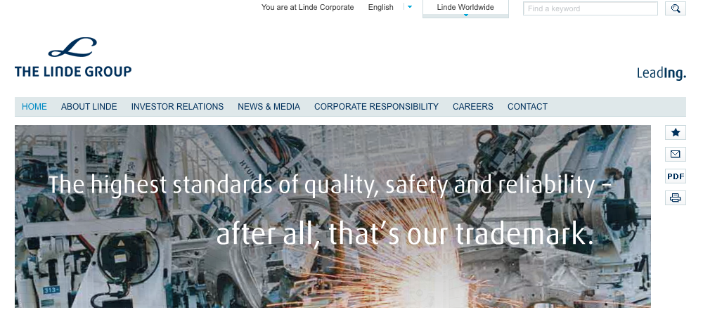 Beim Marken-Relaunch für die Linde Group wurden Logo und Claim getrennt, wie es auch im Print vorgesehen ist. Hier funktioniert es, weil nichts anderes dazwischen steht und die Schrift des Claims ausreichend groß und eigenständig ist.
