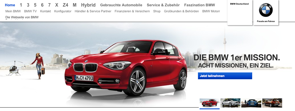 Ein weiteres Problem bei der Übertragung von printbasierten Corporate Design Regeln auf Bildschirm-Medien ist der Umgang mit Taglines. Während wir im Print die Qualität der Schrift auch bei kleinen Schriftgrößen kontrollieren können, wird sie am Bildschirm schnell unleserlich, wie das BMW Logo auf der Website.