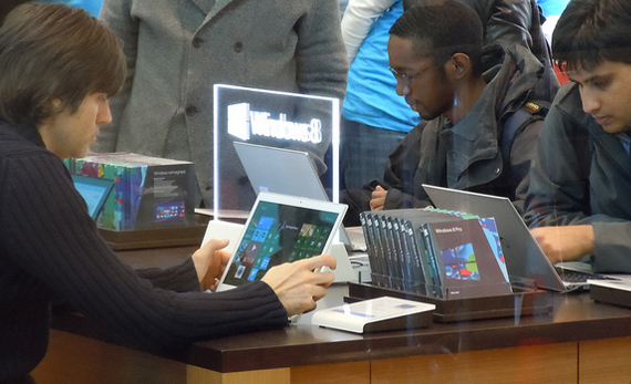 Seit Douglas Engelbart 1967 den Urtyp der Computermaus erfand, hat sich viel in Sachen Interface und Computer-Human-Interaction (CHI) getan. Nicht nur touch sondern auch Stimme, Mimik, Gesten, der ganze Körper und sogar schon Gehirnströme können vom Computer als Input verstanden werden. Tom Cruise bewegte sich schon 2002 im Film „Minority Report“ mit Hilfe eines Lichthandschuhs und gekonnten Armbewegungen durch sein kriminalistisches Videoarchiv. Aber nur wenige ahnten zu diesem Zeitpunkt, wie schnell diese Art der Interaktion im Mainstream ankommen würde. Microsofts ‚Surface‘ Computer (eine Art Laptop/Tablet Hybrid) zeigen eindrucksvoll wie User sofort das Keyboard vermeiden und zu ihrem bevorzugten Input übergehen, dem Touch. Studien zeigen, dass sie dies sogar dann tun, wenn Keyboard und Maus eine schnellere Eingabe ermöglichen würden (wie zum Beispiel bei längeren Formularen). Dieses Foto zeigt Surface User, wie sie den Bildschirm umklammern, um ihn wie einen Tablet mit ihren Daumen benutzen zu können*.